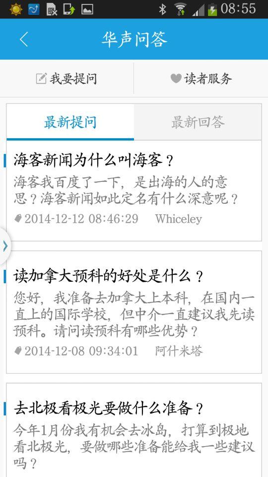 点开海客新闻如海一样湛蓝的图标,映入眼帘的是海客小编为您精心挑选的全球即时资讯。如果你既关心国家大事又想了解社会热点,懂你的海客新闻已经将你之所需悉数呈现在你的手机屏幕上了。“海客”不仅给你想要的新闻内容,还会让你感觉“又快又牛”。小到黄瓜萝卜涨价,大到中美关系进展,不论国内还是国外,为你提供文字+图片“双轮”滚动的新闻大餐。如果你想了解国外留学“哪家强”、回国创业怎么搞,贴心的海客新闻都会在“华声问答”板块为你一一作答。只需要点一下右上角“?”模样的图标,输入你想问的问题,剩下的就交给聪明的“海客”小编来帮你解决吧。【软件功能】