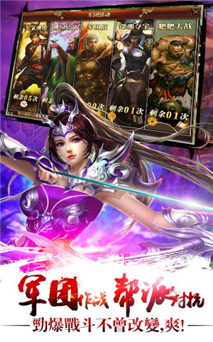 劲爆三国百度版供了手机游戏中一种更加爽快的游戏体验,玩家可以选择四种不同的游戏职业(龙将、剑舞、箭神、军师)进行游戏,每种职业有独立的形象、技能与成长方式,游戏战斗 过程强调操作与动作体验,格斗和连击作为战斗的主要特色。玩家在游戏中可单人,也可与其他玩家组队共同挑战关卡,依照剧情引导,在宏大的三国历史背景下逐 步体验三国故事和人物的风采。同时提供给玩家自身装备、技能、武魂、宝石镶嵌、珍宝合成、兵法、刻印等附加能力的成长方式,玩家可以通过通关关卡、参与活动等等各种方式提升实力。