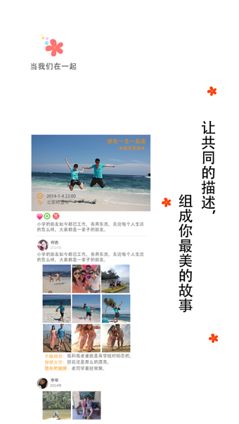 一路花开安卓版打造的一起回忆,才是最美的回忆。每一个参加者都可以在故事里添加自己的文字和照片。众人的不同视角和内容,使故事更加的完整和丰满。【软件特点】