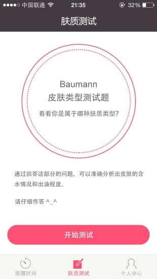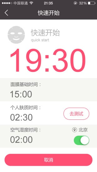 通过精准的肤质测试,全面了解你的肌肤,针对每片面膜,精确地计算出最适合你肤质的敷面膜时间。两步操作,到时提醒!省却了不停看表、定闹钟或者是完全靠感觉的计时方式,在充分保护你肌肤的同时,大幅提升了护肤效率,让面膜变得更好用!【软件功能】