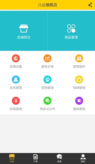 它可以让店长管理微店更方便,不在需要每次管理微店还要进入“八公宠物”微信公众号后台进行管理那种复杂的操作了,它与店铺的微信公众号可以做相互绑定,实现同步管理。下面我们了解一下我们的八公店长的基本功能吧!