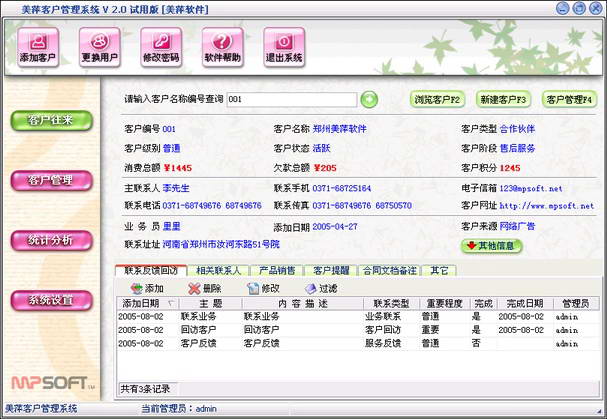 客户往来 : 包括联系反馈回访、相关联系人、产品销售、客户提醒、合同文档备注、其他等功能