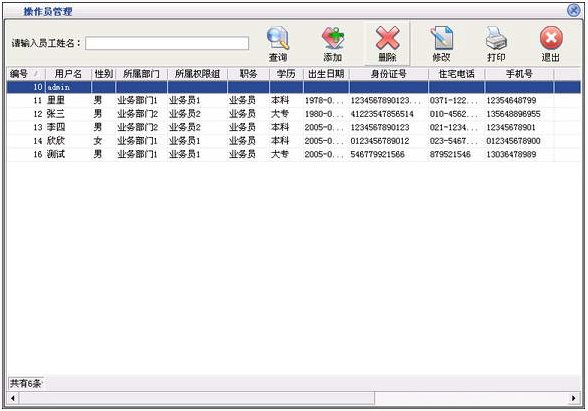 在操作员管理窗口中点击添加按钮,就会弹出添加用户窗口,在用户信息这页里填写用户的相关信息,如果要设置权限只需在所属权限组这栏里选择用户所属的权限组即可。(注意:如果权限组还没有设置,您要点击“用户组权限设置”这页进行权限设置)。如果您要修改(删除)客户信息点击操作员管理窗口中的修改(删除)按钮即可。