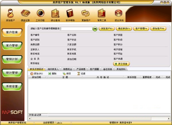 显示的是该客户的联系记录,您可以点击添加(删除,修改)按钮,对该客户的联系记录添加(删除,修改)操作。过滤按钮里您可以只显示某个类型的联系记录和全部的联系记录。