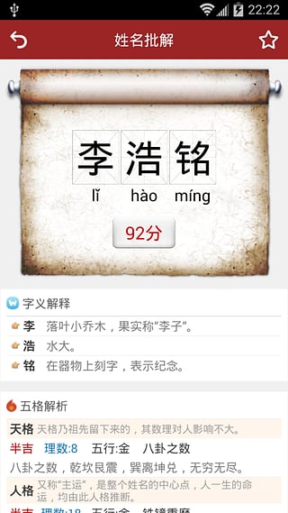 《起名大师》是由一款在玄学大师李林主导下开发的一款专注于起名、改名、解名的专业起名帮助工具。姓名并不只是人的一个称呼,更是人的一种标志,好的名字将会伴随人一生的好运。它在相当大的程度上约束了一个人一生的发展,一个人的成就大小、顺逆变换,都与姓名有很大关系。这其实与八字、风水等玄学的道理是一脉相通的,因为名字是属于个人所独有的,当别人称呼我们姓名的时候,其实等同于对我们念咒语。这相当于别人祝福会为您带来正能量,诅咒会为您带来负能量一样。好的名字必须从人的八字出发,深度剖析八字中的信息,再结合人的性别、属相、汉字音律、意义、字形等方面,才能取得好名。不要埋怨命不好,是您没有对自己负责任,名字不好我们帮您补救!