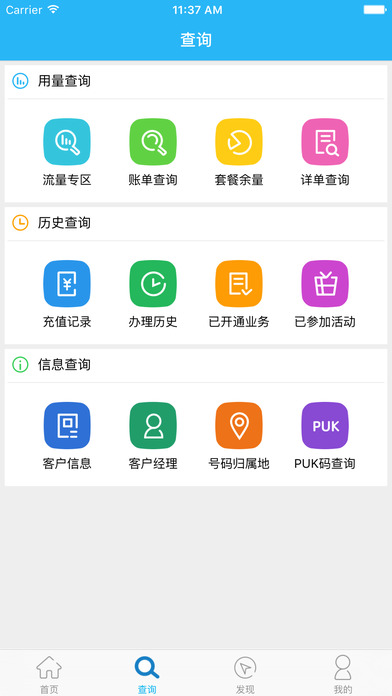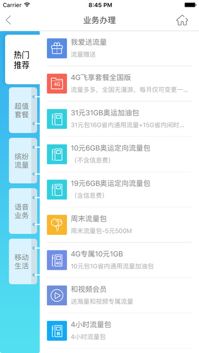 1.流量专区:4G时代,流量才是硬道理。有多少、用哪了,随时掌握、透明消费;买多少、怎么用,智能推荐、帮您搞定!2.业务办理:4G,上网,通话,功能与设置,短/彩信,生活与娱乐,流量特惠包,流量共享