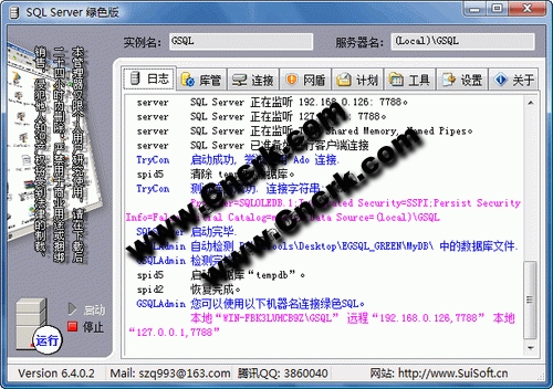 Microsoft SQL Server(MSSQL) V6.4.0.2 简体中文绿色企业版 只保留 GSQL.EXE 版权,其他附带文件版权归美国微软公司所有, 本软件以技术研究为宗旨, 请在下载本软件后24小时内删除附带的 SQL Server 文件或替换为您购买的正版 SQLServer文件, 否则后果自负. 作者不为您承担任何方面的任何责任