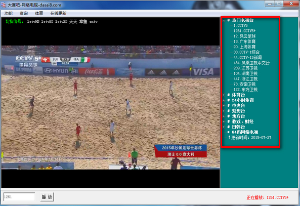 大赛吧网络电视除了可以收看包括CCTV、地方台,如CCTV5,5+、湖南卫视、浙江卫视、东方卫视等海量优秀的电视频道直播外,还提供了国内外重大体育赛事直播信号,涵盖NBA、英超、西甲、斯诺克、中超、CBA、欧冠、世界杯、奥运会、联合会杯、国际冠军杯等各大领域,是体育赛事球迷的装机必备软件。 为了改善用户体验,大赛吧网络电视杜绝任何广告信息。以纯绿色的形象展示给每一位用户。我们承诺,永久免费,永久更新。【使用方法】