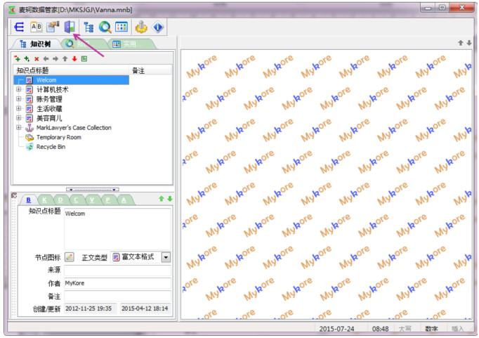 2.程序打开示例笔记库,进入主界面,现在你就可以用数据管家来管理你的个人数据了,例如,双击节点打开节点的正文,修改节点的概要与正文等