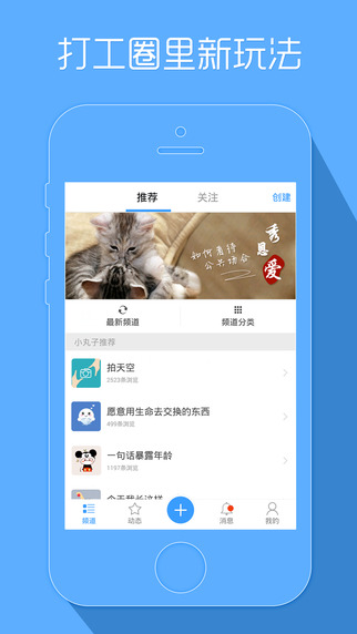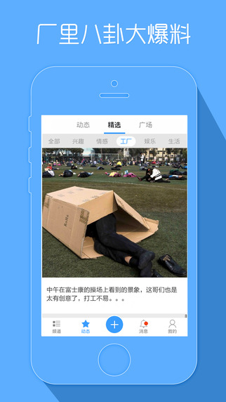 1)关注、建立工厂频道,与同厂工友交流约会2)关注、建立兴趣频道,与志同道合的工友交流互动