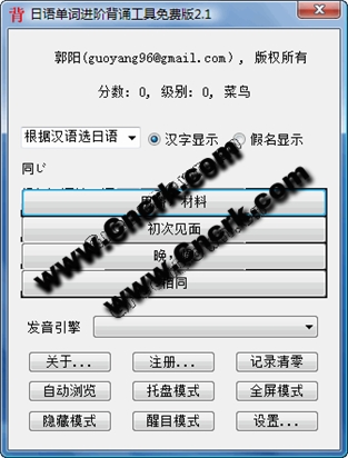 日语单词进阶背诵工具 日语单词进阶背诵工具是一个用来背单词的工具软件, 它是一个绿色软件,解压后可以直接运行执行文件。该工具简洁实用。它采用类似GRE机考的模式,出题让用户选择正确答案。开始出现的单词为难度低的单词,答对后用户的分数逐渐增长, 单词的难度也增加。对于初学者,软件总是出容易的题; 而对于水平高的人,单词难度逐渐增加。因此能适合各种日语水平的用户。而且, 一个单词本身的难度是动态调整的, 单词答对了, 该单词本身的难度就降低, 单词答错了, 该单词本身的难度就上升。 这样单词的难度最终和每个用户的情况相适应