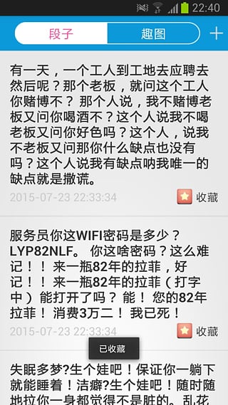 一款生活休闲类的应用,包括搞笑的段子和捧腹趣图,让你在繁忙的生活中,在无聊的时候也可以停下来乐呵乐呵,放松心情。【软件特点】