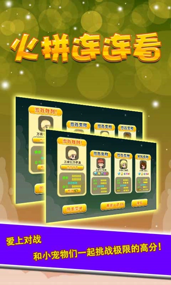 火拼连连看全新版本马上来袭!游戏全面升级,新颖华丽的道具,海量的金币,炫彩钻石,大奖送不停。超萌的图块,涵盖丰富多样的水果、糕点和动物。炫酷的视觉效果,益智游戏和娱乐的完美结合。网络真人对战,三种全新玩法,火爆的战斗,流畅的游戏体验,酣畅淋漓的快感,根本停不下来!