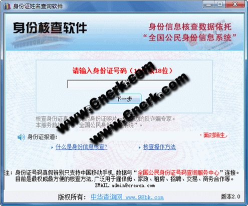 身份证姓名查询软件 V2.0 简体中文绿色免费版 该软件依全国公民身份信息系统提供权威数据,用户向系统提交被核查人姓名、身份证号码,经过与数据库中的信息进行对比,系统返回一致或者不一致的核查结果;如果结果一致,用户还可以进一步比对照片。该身份证查询方式是目前该领域最方便快捷,权威性最强的一种,广泛应用于雇保姆、家政、租房、招聘、交友、交易、商务合作等预防假证诈骗,不用再跑公安局户籍部门了!