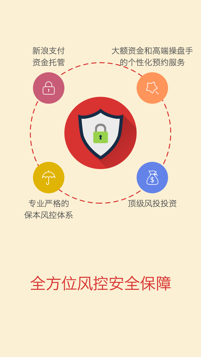 3、 安全可靠:资金由银行及业内领先支付机构全程监管,多级业界成熟风控机制结合成熟资管软件,保障资金安全。