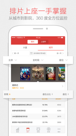 3、上座率:国内最准确的电影上座率监控工具,随时随地查询热映影片的上座率、场均人次,全面监控电影热度;