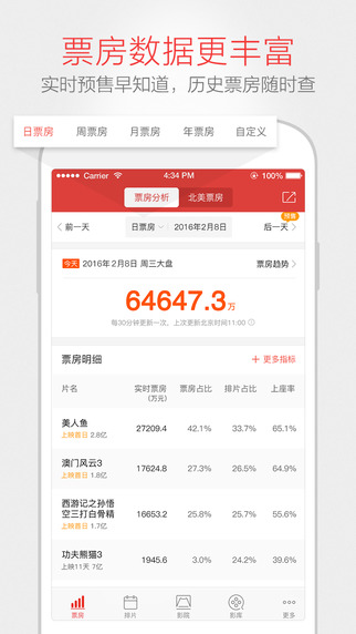 1、实时票房:国内最精准的实时票房查询工具,及时、准确、高效掌握电影市场实时动态;2、排片:国内最超前的排片查询工具,提前一个月查询热门档期排片,随时掌握各影片、各城市、各大影院的排片场次及占比;
