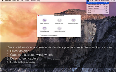 Snapshot Editor for Mac支持您实时捕获屏幕快照。注释截图或图像,支持选择不同形状像线,箭头,长方形,圆形,自由画,文本注释,甚至视频滤镜效果的作用。Snapshot Editor for Mac支持高效工作,用户可以自定义热键,软件打开时候运行在快速启动菜单栏,截图可以保存在剪贴板,或者直接应用到其他应用程序上,同时也能通过电子邮件进行分享和传播。