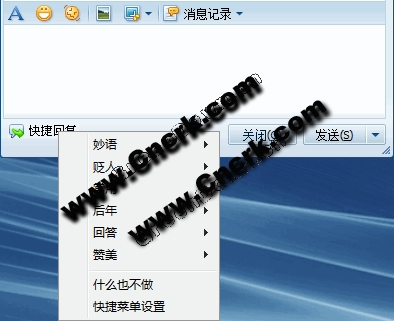 QQ聊天时的快捷菜单增强软件;聊天时使用快捷菜单是很方便快捷的,尤其是象客户服务类的,回答客户提问都是重复几句话的,快捷菜单就很重要了,但是QQ这个菜单太简单了,所以我这个软件就产生了。虽然网上有好多QQ聊天助手、伴侣等此类的辅助软件,但是多了个累赘窗口,总是不爽,还不如点快捷菜单。最新增加对任意输入框支持,只要按下Alt+鼠标在输入框中点击,就会开启快捷菜单,所以不再是QQ的专利了,很有广普性,可以用在旺旺,UC,等等任何聊天软件上了,当然也可以用在TM上,除了QQ上用按钮,其他软件都可以用 Alt+鼠标左 开启菜单
