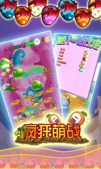 疯狂萌战是一款休闲益智类型的游戏,游戏创新的融合了打地鼠和划水的一些元素,游戏采用类似的九宫格土地样式,萝卜会从土地上的一些洞口随机冒出来,你只需要在那一瞬间用手指滑动冒出洞口的萝即可,游戏期间划的萝卜越多,得到的分数也就越多。