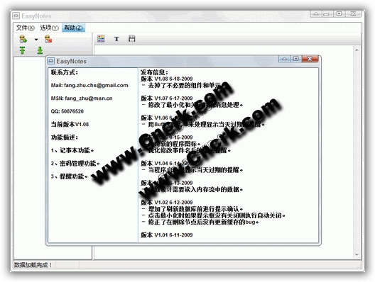 EasyNotes V1.15 简体中文绿色免费版 EasyNotes是一款日志记录软件,你可以将要做的事情记录在案,不用担心会忘掉重要的约会和商务日程。它还可以添加密码保护、同步到Twitter、搜索、复制和粘贴等等便捷的功能。