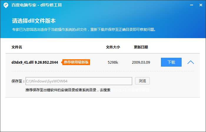 3、扫描完成,专家为您筛选出适合于当前操作系统的dll文件,重新下载并保存至正确目录即可修复问题