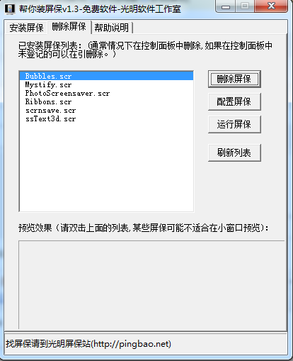 帮你装屏保是一款实用的屏保安装与删除软件,内置多款屏保,而且增添、删除屏保非常方便,并支持预览。
