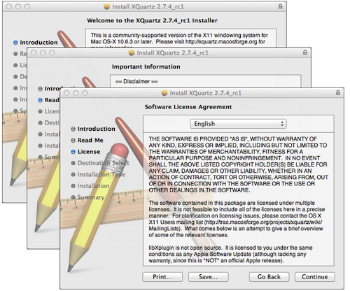 下载完成DMG程序包, 从您系统的下载部分运行它:第一个必需的组件是XQuartz. 这是使用Mac OS Windows X系统的一个应用程序. X Window系统提供标准工具和条款在类似Unix系统支持图形用户界面。如果您已经安装或者决定推迟安装XQuartz, 分别点击 "Don't install XQuartz for the moment"或者"I've downloaded file by myself".XQuartz 的安装分为几个阶段. 首先, 您应该阅读这个重要信息 (Read Me) 和接受许可条件。