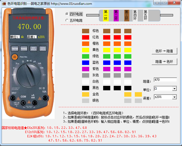 1、能直接根据色环电阻的颜色计算出电阻值和偏差;