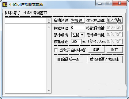 小贱lol连招脚本辅助是一款专为LOL英雄联盟玩家制作的连招辅助,这款辅助可以帮助玩家在游戏中进行一键连招,为玩家降低游戏难度,从此告别手残,通过辅助进行快速技能连接,怒抢人头,轻松获得游戏胜利,成为游戏中的大神!