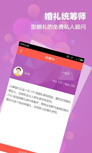 在线支付、标准化服务、婚礼统筹师、婚礼计划、发现“资讯”、婚礼惠、分享交流、及时沟通、海量婚礼人、婚礼摄像、婚礼摄影、婚礼策划、跟拍、跟妆、司仪、婚礼统筹、婚礼策划、结婚用品……婚礼颂统统搞定!
