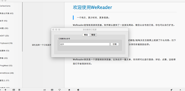 在wereader mac版软件中,你可以收藏文章,放入 「Collections」目录浏览,打开每一篇文章会把你直接带到原网页中(微信号订阅文章除外),登录,评论都还可以操作。扫下二维码即可将你的阅读收藏列表,分享到朋友圈。默认的订阅源只有很少的媒体可以阅读,你可以在设置里勾选或取消订阅他们。