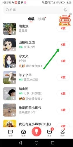 1、用户进入点歌界面,挑选自己想合唱的歌曲,点击歌曲旁的【K歌】按钮。