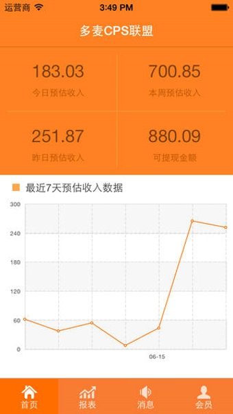 1、首页:会员账户数据,最近7天预估收入折线图;2、数据报表:商家推广数据以及最新订单跟踪情况;