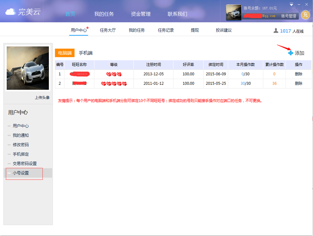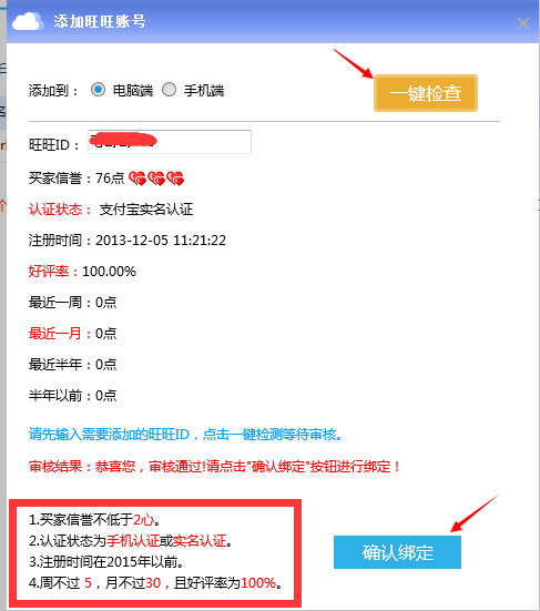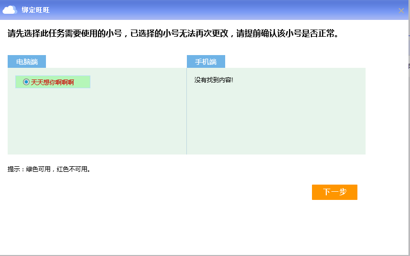 5.绑定旺旺:选择一个已绑定小号点击下一步。