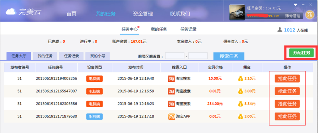 3.接任务:进入“任务大厅”或 “我的任务”,点击“分配任务”-“抢此任务”。