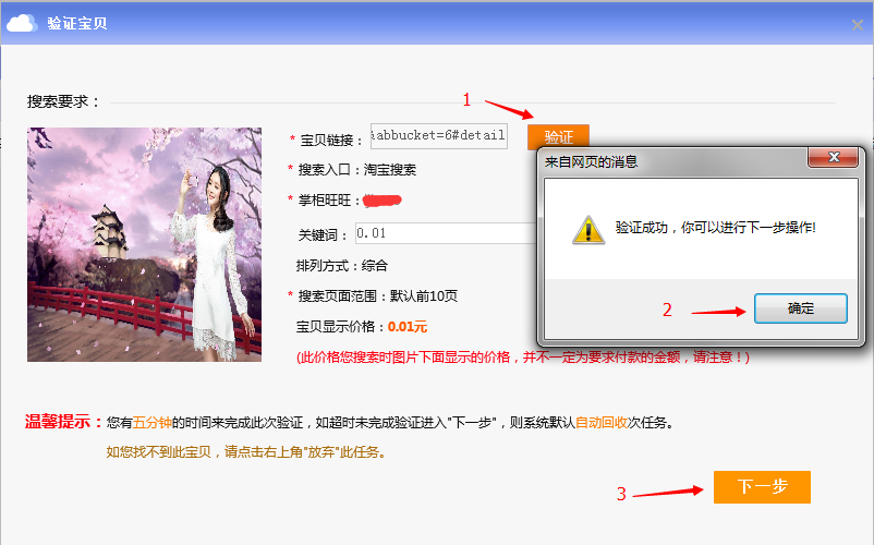 4.验证宝贝:点击验证宝贝,根据关键词及搜索要求输入宝贝链接地址,点击验证,验证通过点击下一步。