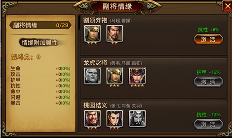 “麾下众将征天下,三国情义永流传”副将情义也是副将系统的重要组成部分。副将情义是数名副将之间的联系,大家收集并召唤该情义需求的所有副将后,点击“激活”按钮即可激活此情义,为主角增加属性和其他特殊能力。