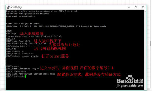 敲入图片上的代码,红色的字是代码的解释,帮助理解。你会看到有的是一个字母或者几个字母,这是利用了自动补全的功能,可以节省下大量的时间,提高效率。比如我想打telnet,我就可以只打te按下TAB键,系统在下一行就自动补齐正确的命令。但前提是在正确的视图模式下,所以一定要确保试图模式的正确性。