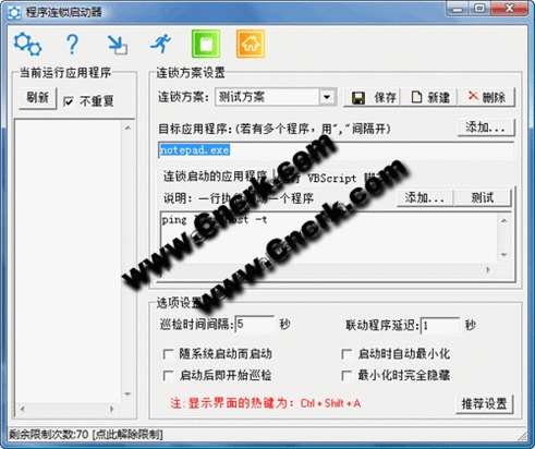程序连锁启动器[exelink]是一个用于实现应用程序之间连锁启动关系的工具。连锁启动是指程序之间需要同时运行的关系,比如当A软件运行时,需要同时启动B和C软件,又或者A、B、C软件在任何时候均需要同时运行等.利用本工具来很方便的实现以上功能,尤其适合启动一些针对某程序的后台、外挂、接口处理程序。在本工具中若把A软件作为目标程序,B、C软件设为连锁启动程序,则当本软件发现A已运行时,便会自动启动B和C,即使B、C因人为或意外退出,本软件也会再次启动B、C,直至其稳定运行为止。本工具可以设为随系统自动启动和退出,并隐藏自身,不会影响系统任何正常功能。1.2版本根据用户的要求,加入了对VBS脚本的支持,用户可以往程序添加VBS脚本,当发现目标程序时,可以执行VBS脚本