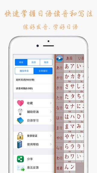 日本语五十音图app非常适合初学日语的朋友使用。日本语五十音图app帮你在入门阶段快速掌握日语五十音图的读音和写法,为进一步学习日语打好基础。【软件特点】
