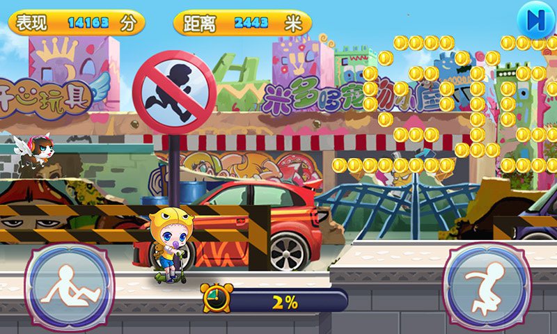 《酷跑滑板鞋》是一款精美的跑酷游戏,节奏十分地块,考验玩家的眼力与敏捷度。按下箭头,让游戏人物在地面滑动;按下跳跃按钮,游戏玩家会在跑道上跳跃,展示ta敏捷的身手,甚至跳出花样跟斗。要让游戏玩家收集尽量多的金币,金币可以购买神奇小道具哦。如果幸运吃到一些法宝,更是可以帮助游戏玩家跑得更快更远。【游戏特点】