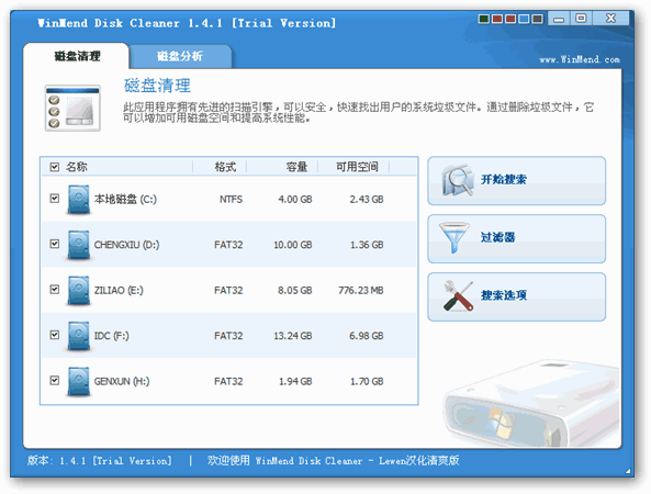 WinMend Disk Cleaner是一款磁盘清理软件,可以帮助你清理系统产生的各种垃圾文件,释放磁盘空间,可自定义需要清理的垃圾文件类型后缀名,也可设定不需要清理的文件列表和目录