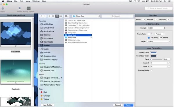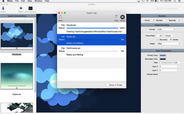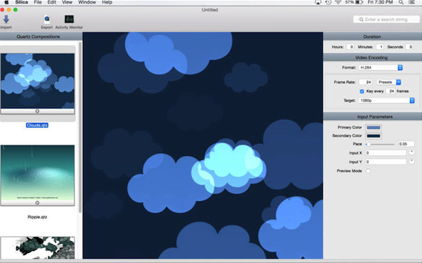 Silica for Mac支持视频编码——允许您控制转换过程通过指定的编码格式,压缩质量、帧率、关键帧间隔和数据速率限制。支持动态长度电影——呈现每个组成任何用户指定长度。电影可能有一个24小时的长度。支持自定义转换——允许用户查看和修改任何输入参数。更改这些参数保存在项目文件中,以供将来使用。