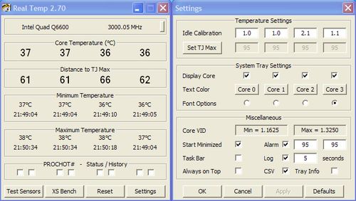 Real Temp V3.7.0 绿色免费版下载 Real Temp是一款专为Intel处理器开发的温度检测工具,支持各种单核心、双核心、四核心型号。它根据每个核心内集成的数字热敏传感器(DTS)报告其温度,并同时给出和最高允许温度(TjMax)的距离,提醒你注意保持清凉。与其他许多的传感器不同,它可以同样地工作于笔记型和桌面型电脑。Real Temp 不需安装,只需要解压到文件夹中或者外部磁盘,然后直接运行即可。