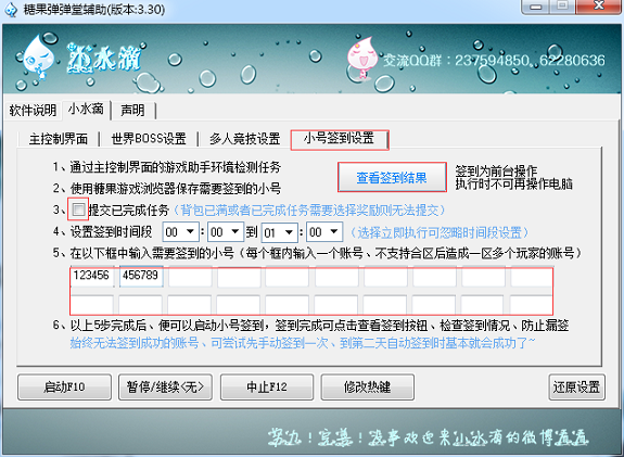 3.提交已完成任务主要是方便小号领取喇叭等特殊活动任务奖励,提交任务情况可在签到结果中查看。