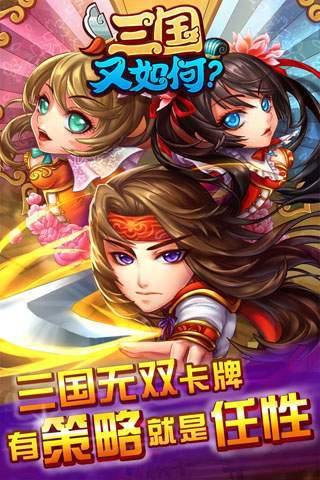 三国又如何是一款以三国为游戏背景的策略卡牌手游。该游戏画面精致大气,游戏系统独特多样,其中最为特色的就是那五花八门的战术了,多种策略战斗随意搭配,快来DIY属于自己的战斗卡牌吧!