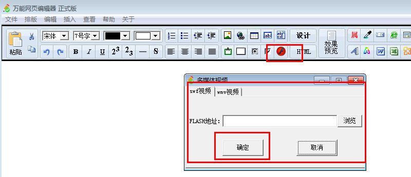 很多朋友在制作网页的时候需要插入视频,只要在万能网页编辑器中点击flash按钮然后选择视频类型,导入视频的flash地址即可。
