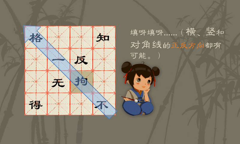游戏时选字填空,构成纵、横或对角线交错排列的四字成语,每个字都属于至少一条成语。