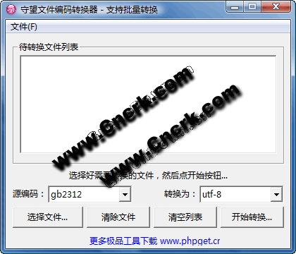守望文件编码转换器支持单个或批量文件编码转换,支持GBK、UTF-8、Unicode编码互换!可以方便网站设计人员在这几种编码之间进行转换.